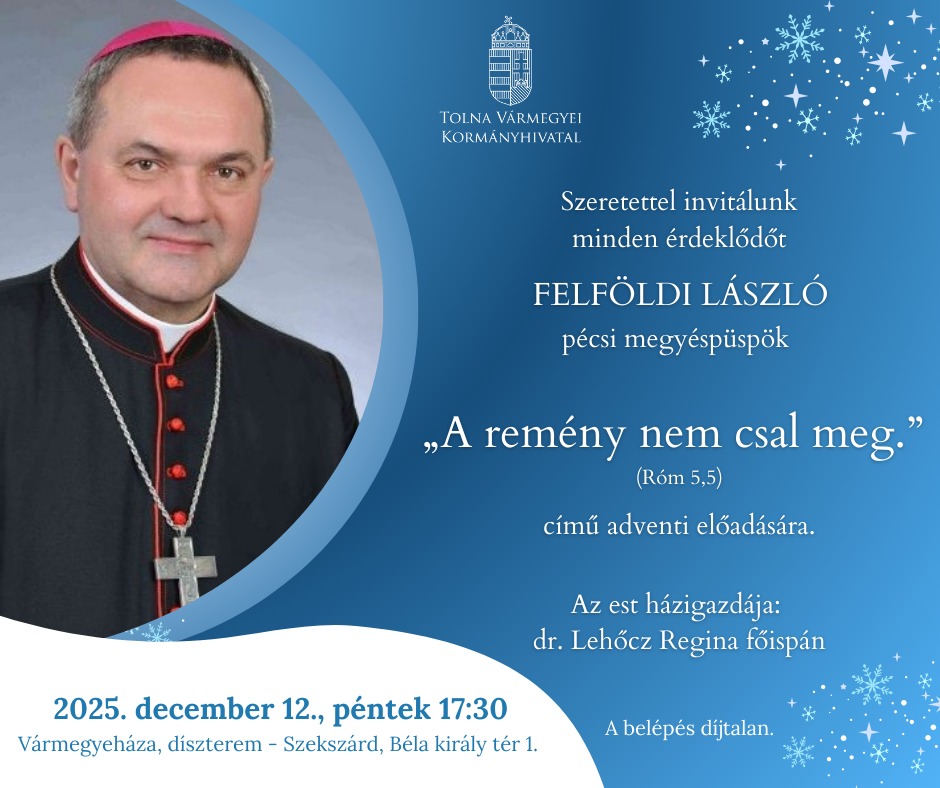 Felföldi László pécsi megyéspüspök adventi előadására várják az édeklődőket Szekszárdon. A Tolna Vármegyei Kormányhivatal programjának helyszíne a Vármegyeháza díszterme lesz.