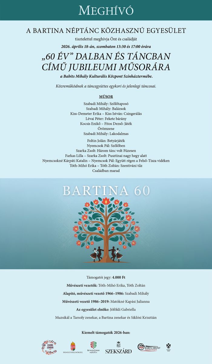 Az intézmény Színháztermében április 18-án, szombaton 13:30-kor és 17 órakor kerül sor az egyesület ”60 év” dalban és táncban című jubileumi, dupla gálaműsorára.
