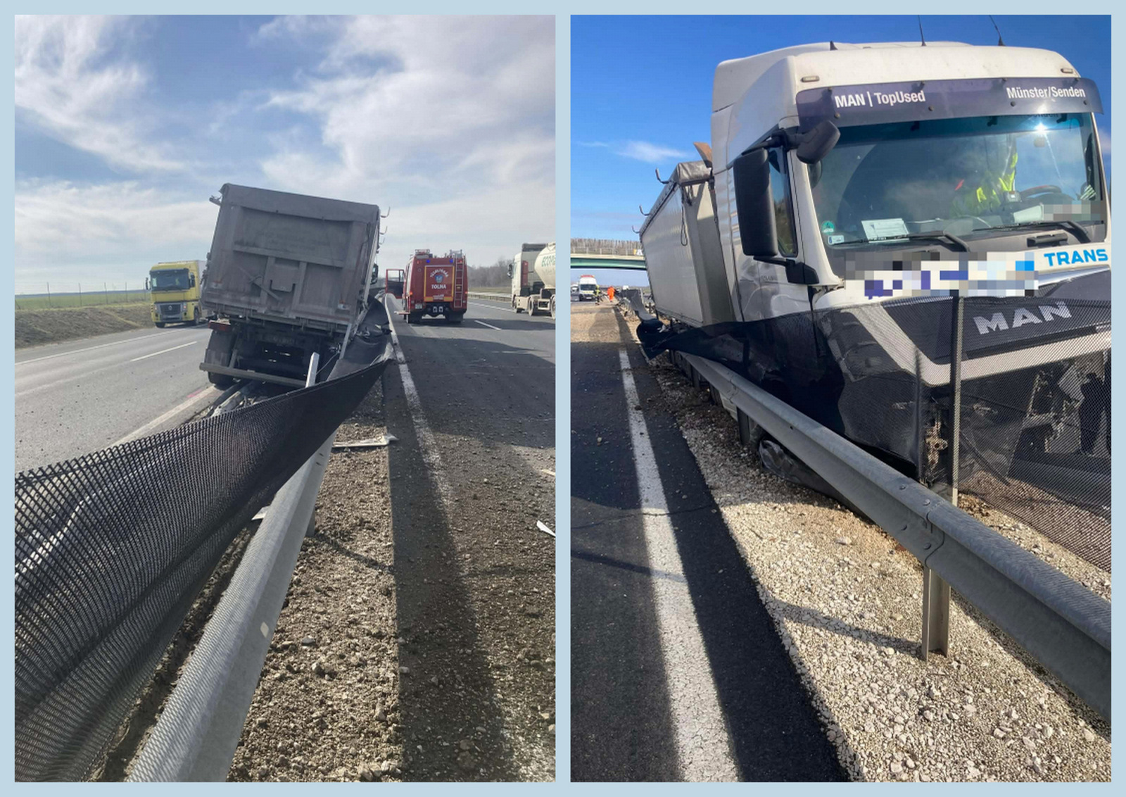 Átszakította a pályatesteket elválasztó szalagkorlátot, majd a Budapest felé vezető pályatesten állt meg egy Pécs irányába haladó, sódert szállító kamion hétfő délelőtt az M6-os autópálya 127. kilométerénél. A baleset helyszínére a tolnai önkormányzati tűzoltók vonultak, akik áramtalanították a járművet, valamint közreműködtek az úttest törmelékmentesítésében. Személyi sérülés nem történt.