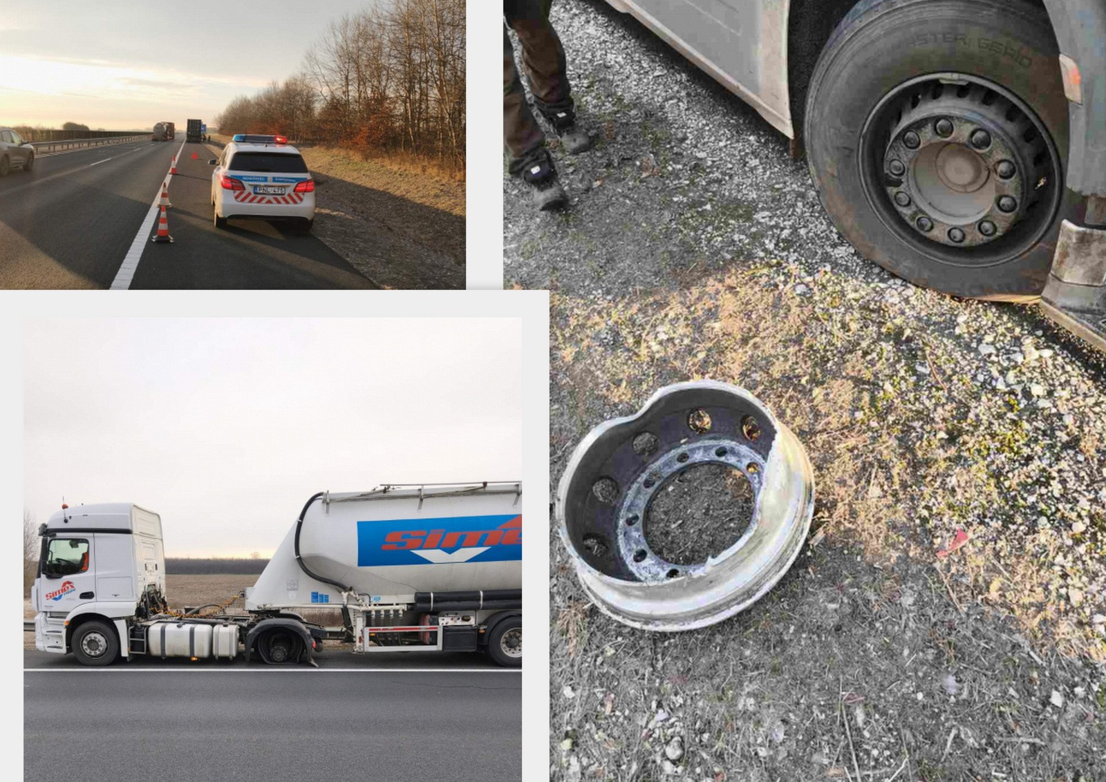 Menet közben leszakadt egy nyergesvontató bal hátsó kereke, majd az alkatrész a szemközti pályatesten landolt hétfő reggel Tolna térségében, az M6-os autópálya 136. kilométerénél, Fácánkert magasságában. Az elszabadult felninek egy személyautó és egy konténerszállító kamion is nekihajtott. Az eseményt követően mindhárom jármű a leállósávban állt meg.