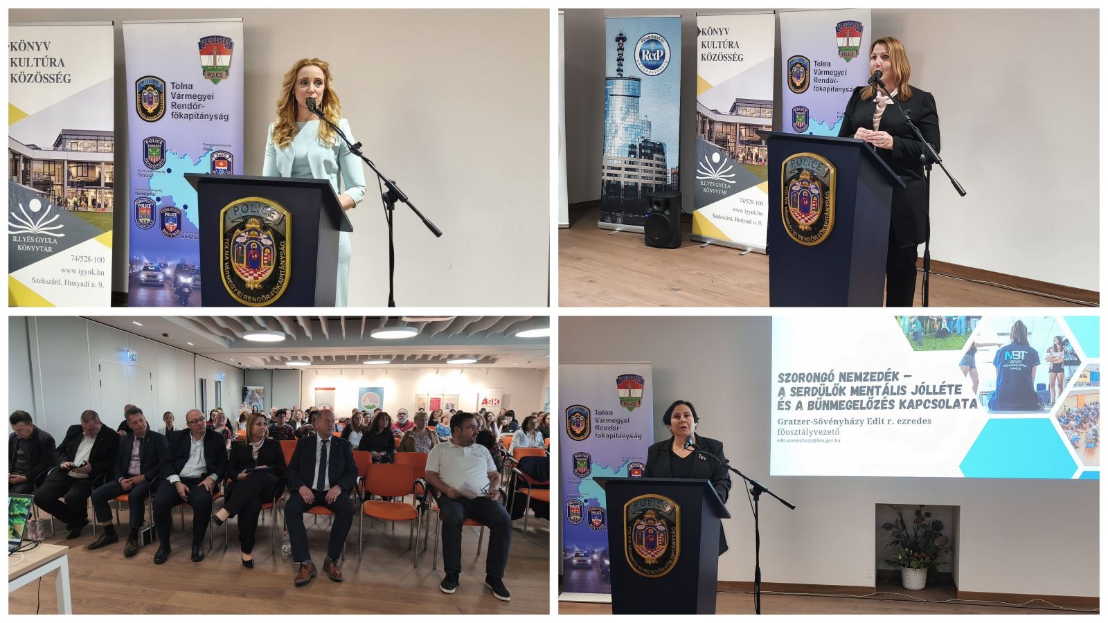 Bűnmegelőzési szakmai napot rendeztek április 14-én a Szekszárdi Tudásközpontban Új generációk, új kihívások – közös megoldások címmel.A konferenciát a Tolna Vármegyei Rendőr-főkapitányság szervezte a Tolna Vármegyei Balassa János Kórház Szekszárdi Egészségfejlesztési Irodájával. A nagyszabású rendezvény az egészség világnapjához és a bűnmegelőzés napjához kapcsolódva a prevenció fontosságára, az egészségtudatos életmódra és a biztonságos életvitelre hívta fel a figyelmet. Középpontjában a fiatalok testi, mentális egészsége és biztonsága állt, kiemelt céllal az egészségmegőrzés és a bűnmegelőzés területeinek összekapcsolása, valamint az ifjúságvédelemben dolgozó szakemberek együttműködésének erősítése.