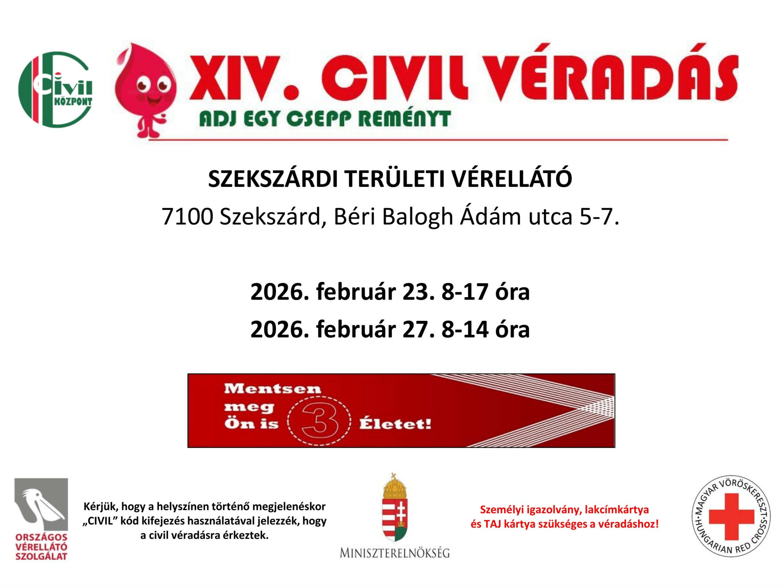 Újra várja az önzetlen véradókat Szekszárdon a Civil Véradás, immár 24. alkalommal szervezik meg az eseményt. Az időpontok február 23 és 24. Adj vért és ezzel együtt lehetőséget az életre!