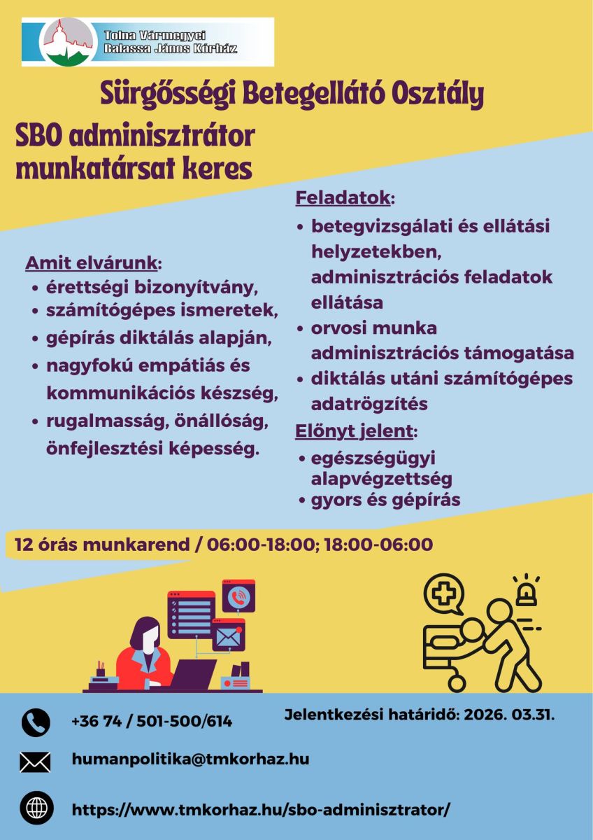 A Tolna Vármegyei Balassa János Kórház Sürgősségi Betegellátó Osztálya adminisztrátort keres. Ha van érettségid, jól bánsz a klaviatúrával és empatikus vagy, akkor ne várj! Minden részlet a plakáton.