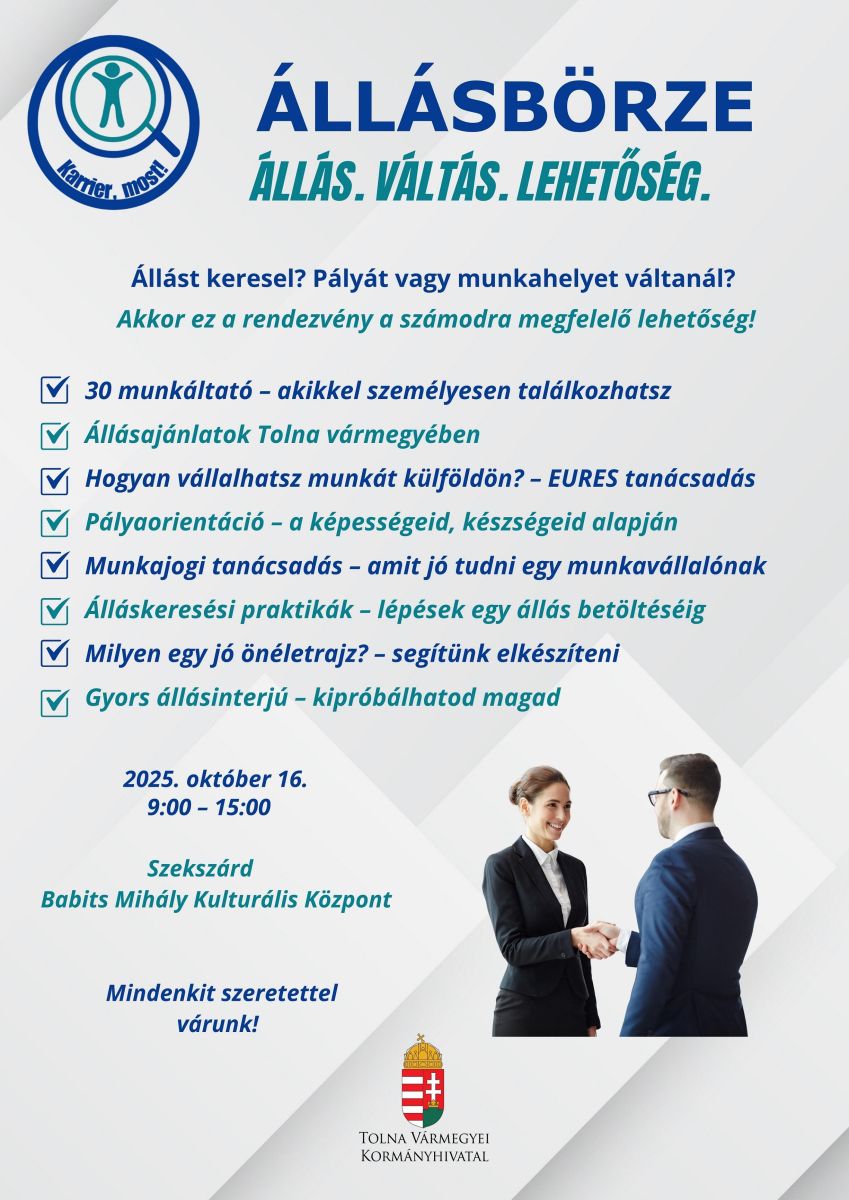 A Tolna Vármegyei Kormányhivatal 2025. október 16-án, 9 és 15 óra között Állásbörzét szervez Szekszárdon, a Babits Mihály Kulturális Központban.