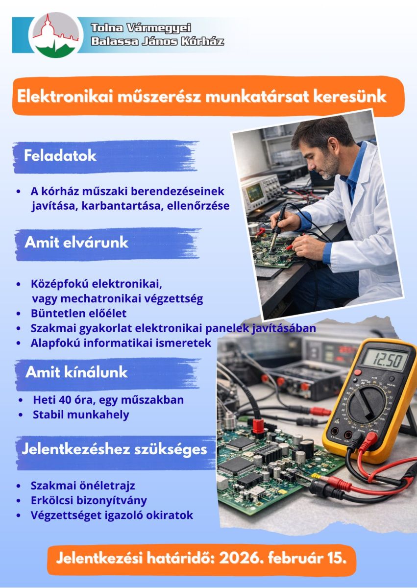 Elektronikai műszerészt keres a kórház. Az alábbiakban olvashatod a feltételeket.
