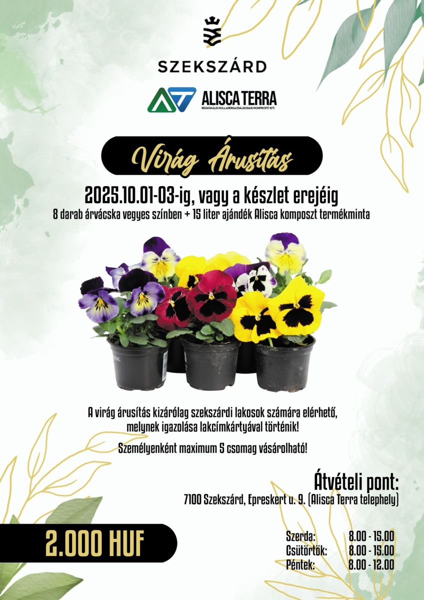 "Szekszárdi lakosok részére október 1-3. között – vagy a készlet erejéig – ismét virágvásárt tart Szekszárd MJV Önkormányzata az Alisca Terra Nkft.-vel közösen. A 8 darabos ÁRVÁCSKA csomagok vegyes színben 2000 forintért vihetők (max. 5 csomag/lakos) az Alisca Terra NKft. telephelyéről, az Epreskert utca 9-ből"