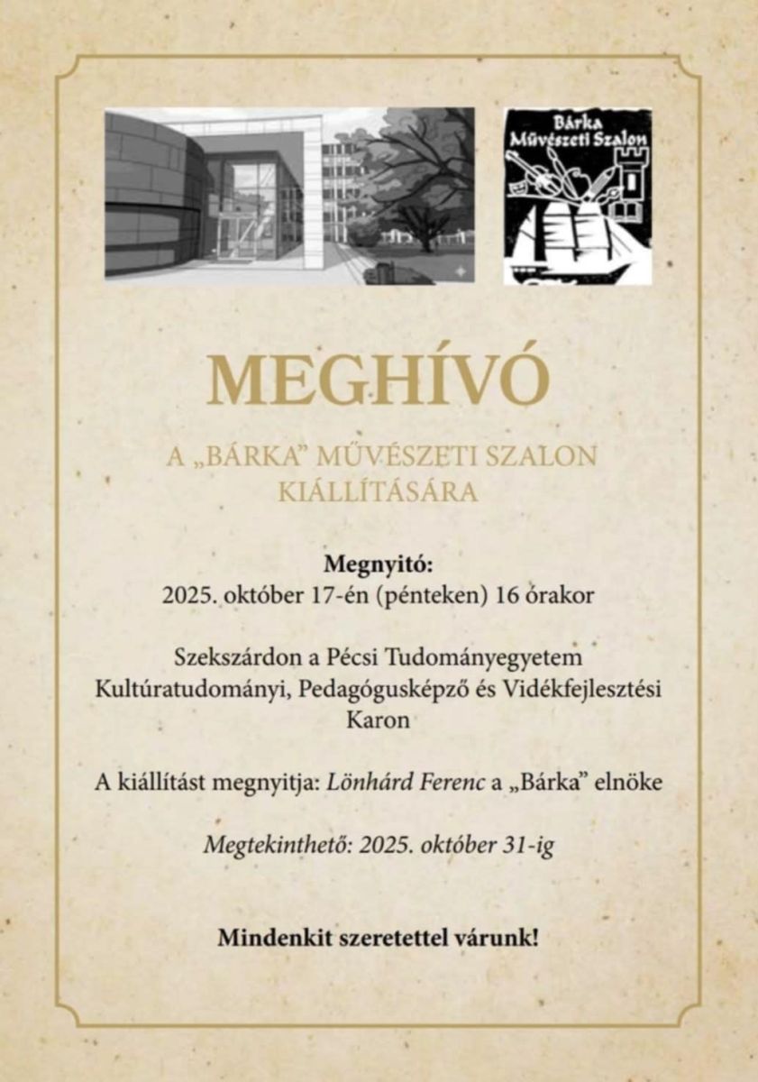 Pénteken megnyíló kiállításra szeretnénk felhívni olvasóink figyelmét. A Pécsi Tudományegyetem Kultúraturatudományi, Pedagógusképző és Vidékfejlesztési Karán lesz tárlat a Bárka alkotóitól.