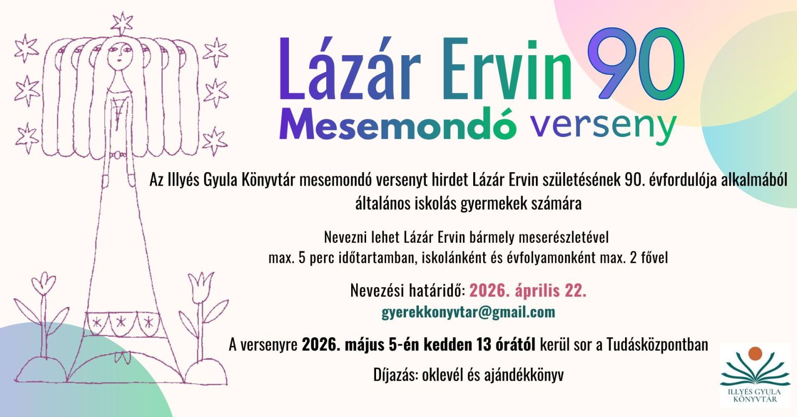 Az Illyés Gyula Könyvtár szeretettel hívja az általános iskolás diákokat Lázár Ervin születésének 90. évfordulójára rendezendő mesemondó versenyére.