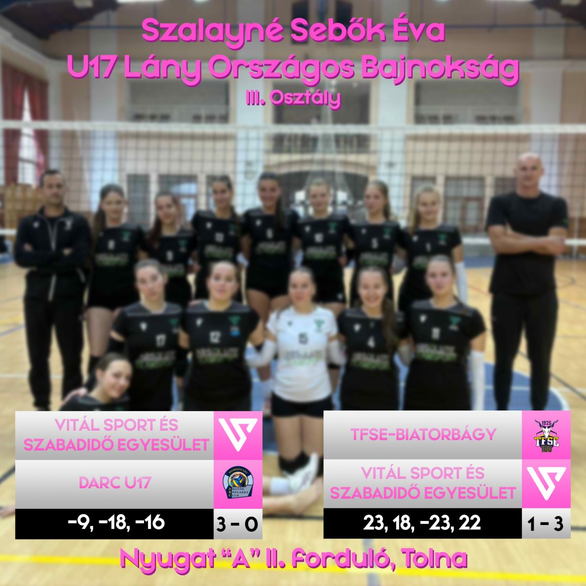 A Vitál Sport és Szabadidős Egyesület közösségi oldalán írt arról, hogy U17-es lány csapatuk a hétvégén Tolnán lépett pályára a Szalayné Sebők Éva Országos Bajnokság III. osztályában, ahol ezúttal a Dombóvári Amatőr Röplabda Club és a TFSE-Biatorbágy csapata volt az ellenfél.