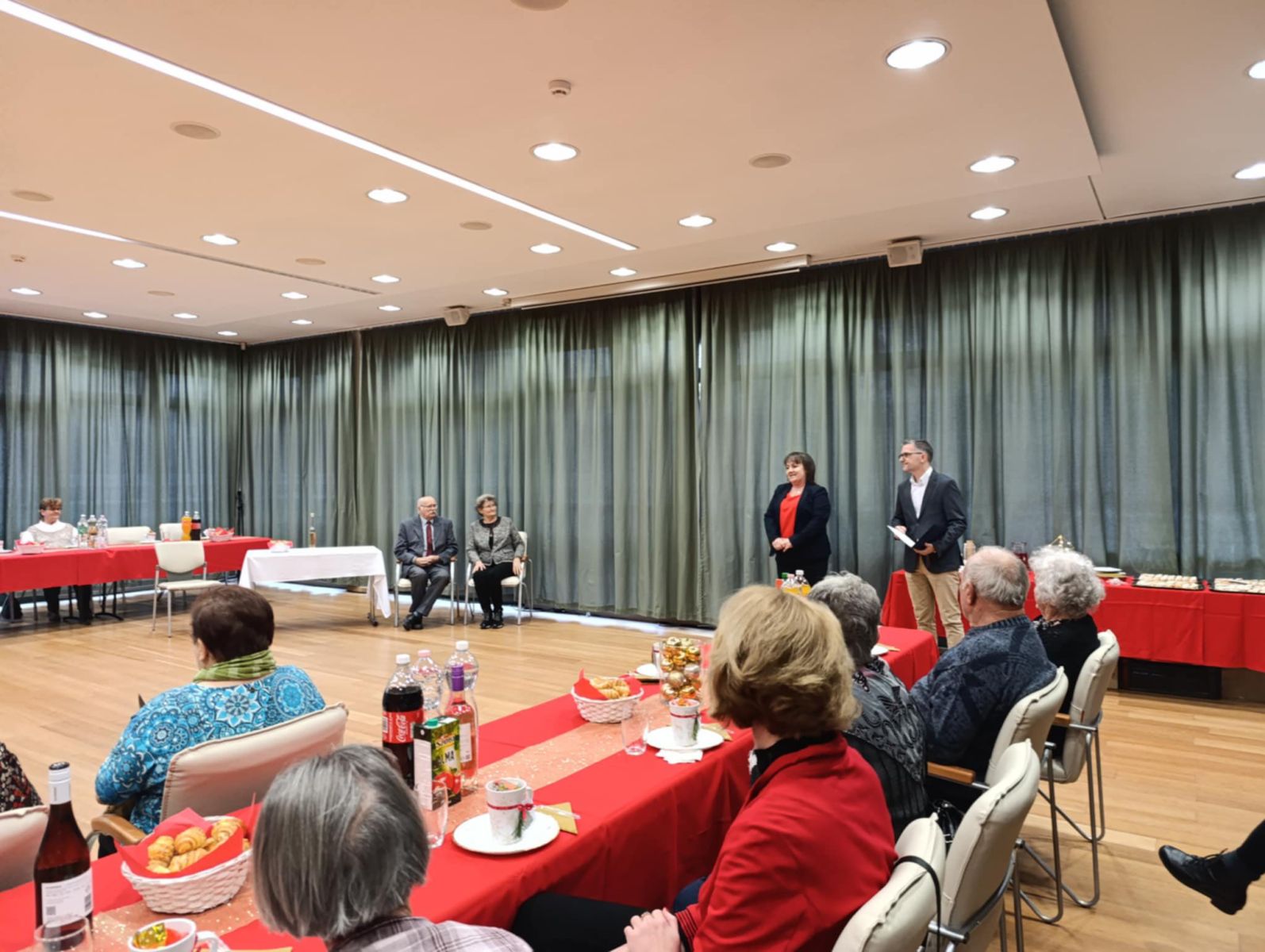 A találkozón először Gonda Mária, az intézmény jelenlegi ügyvezető igazgatója köszöntötte a vendégeket. Közreműködött Lantos László kollégájuk fia, Lantos Gergely, aki Ady Endre Kis, karácsonyi ének című versét szavalta el, míg Salamon László a költő Karácsonyi rege című alkotását. Máté Zoltán kollégánk lánya, Máté Janka egy dalcsokorral érkezett, míg a Bukovinai Székelyek Országos Szövetségének Betlehem csoportja egy andrásfalvi betlehemes játékkal kedveskedett a megjelenteknek.