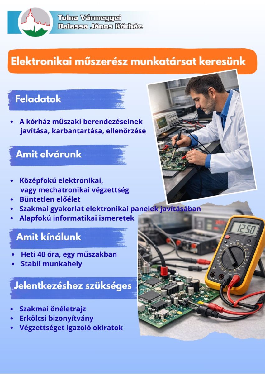 A Tolna Vármegyei Balassa János Kórház Üzemeltetési Osztálya elektronikai műszerészmunkatársat keres.