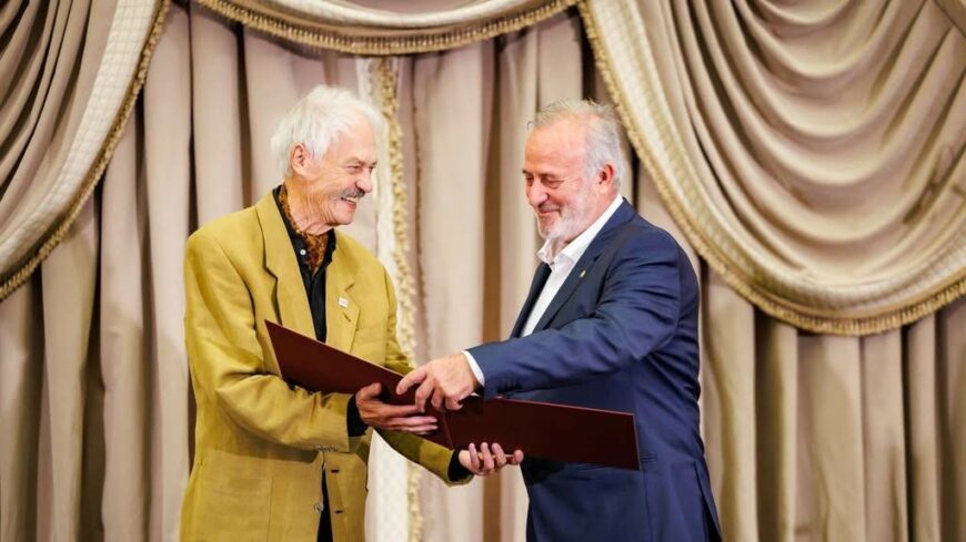 "Dr. Fusz György keramikusművész a díjat Sára Ernőtől, az MMA Iparművészeti és Tervezőművészeti Tagozatának vezetőjétől vette át"