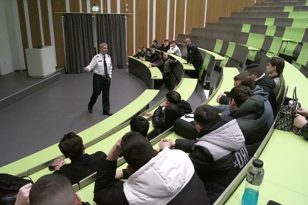 A rendőrség munkatársait és a diákokat Dr. Kovács Richárd r. őrnagy a Nemzeti Közszolgálati Egyetem Közbiztonsági Tanszékének mesteroktatója fogadta és egy általános tájékoztatást adott nekik.