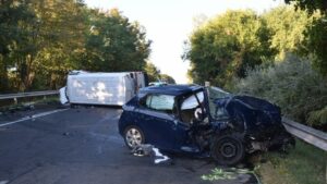A baleset során a mentőautó egy személyautóval ütközött össze a 16. kerületében, a Csömöri úton.