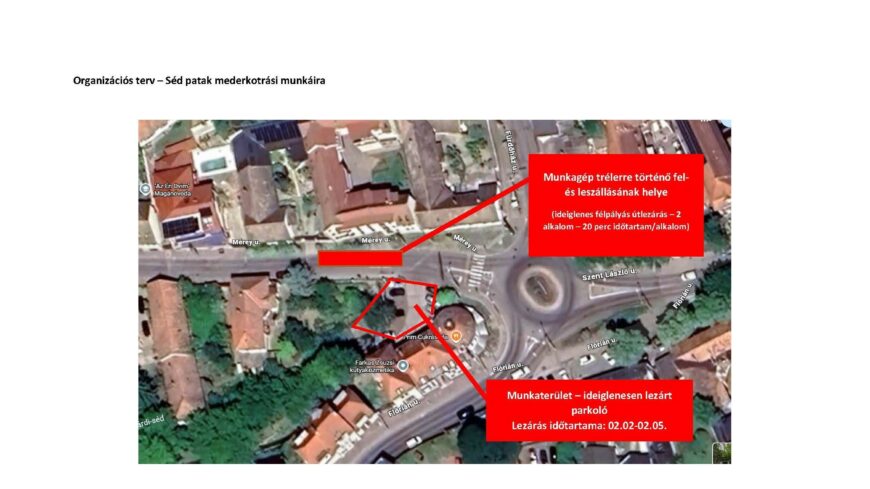 A Séd patak mederkotrását érintő munkálatok miatt félpályás ideiglenes forgalomkorlátozás lesz a Mérey utca elején 2026. február 3-án, kedden 10 óra környékén és a munkálatoktól függően február 4-én vagy 5-én (szerdán v. csütörtökön) forgalmi csúcsidőszakon kívül egy-egy alkalommal, előreláthatóan húsz perc időtartamra.
