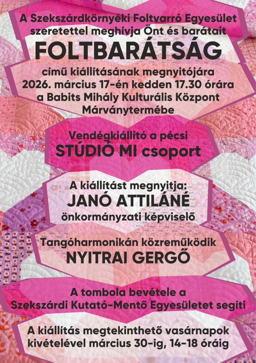 A Szekszárdkörnyéki Foltvarró Egyesület március 17-én 17.30-ra várja az érdeklődő közönséget "Foltbarátság" című kiállításának megnyitójára.