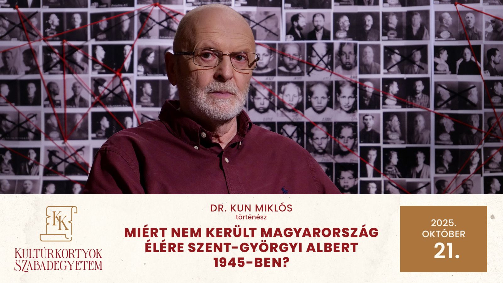 Mi történt volna, ha a háború utáni Magyarország élére nem politikus, hanem egy Nobel-díjas tudós kerül? Kun Miklós Széchenyi-díjas történész eddig ismeretlen szovjet levéltári források alapján mutatja be, hogy Szent-Györgyi Albert komoly eséllyel merült fel a szovjetek számára, mint lehetséges magyar államfő. Az előadás felfedi, hogyan próbálta Szent-Györgyi kivezetni az országot a háborúból, hogyan került a szovjet politika látóterébe – és miért fordultak el tőle végül Moszkvában. Egy különleges történet tudományról, bátorságról és egy elszalasztott történelmi pillanatról.