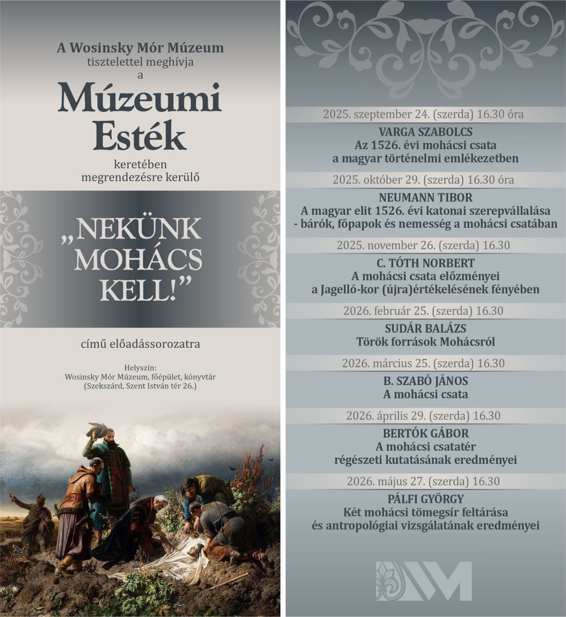 - 2026. február 25. (szerda) 16.30 – Wosinsky Mór Múzeum:nMúzeumi Esték: Török források Mohácsról – dr. Sudár Balázs előadása