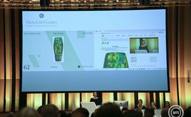 Tízmillió forintos kikiáltási árról indult, majd egészen 20 millió forintig emelkedett az ára egy 1900-ból származó, tűzliliomos díszítésű, Tiffany-rajzos óriásvázának.
