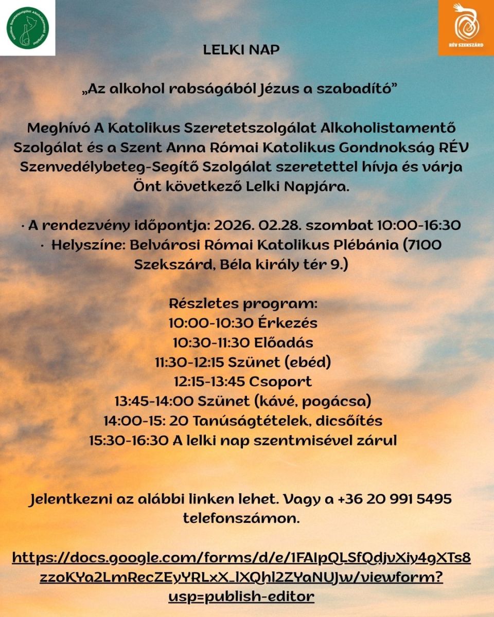 „Az alkohol rabságából Jézus a szabadító” című lelki napra várják a szervezők az érdeklődőket. A rendezvény február 28-án, szombaton 10:00-16:30 között lesz a Belvárosi Római Katolikus Plébánia (7100 Szekszárd, Béla király tér 9.) épületében.