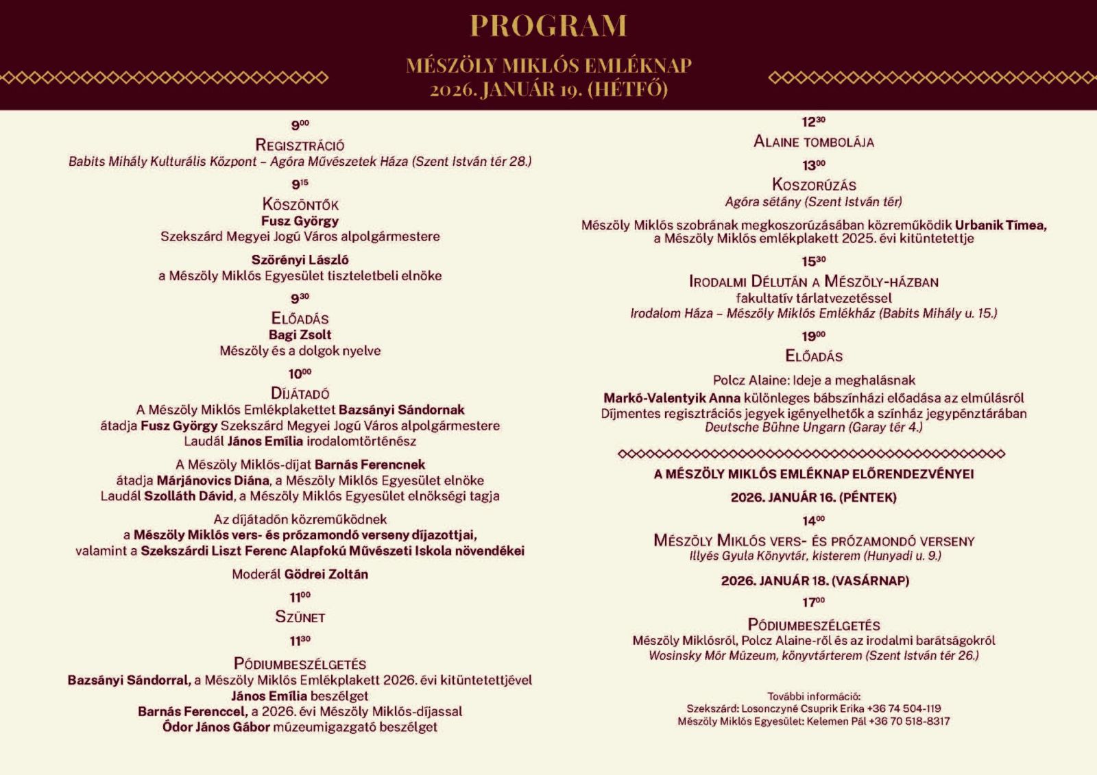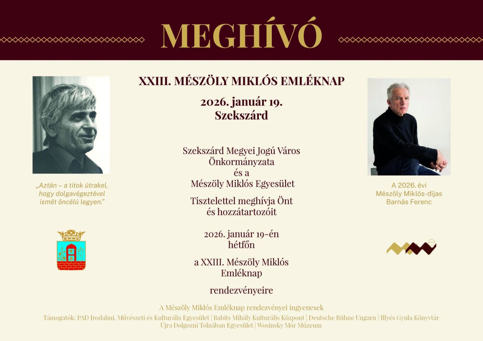 Január 19-én hétfőn várja a kultúra iránt érdeklődőket Szekszárdon a XXIII. Mészöly Miklós Emléknap. Az egész napos esemény számos programot kínál, melyet megtalálsz az alábbi meghívóban.