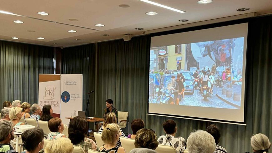 A városról, környékéről, élményeiről a Kultúrkortyok Szabadegyetem szezonnyitó, első előadásában mesélt, szinte teltház előtt. Humorral fűszerezett eéőadásában kapcsolódott a látvány és az általa játszott zene. A közönség pedig hallhatott a nápolyi hétköznapokról, a turizmus napos és árnyoldaláról. Az előadást követően – stílusosan – nápolyival kínálták a vendégeket.