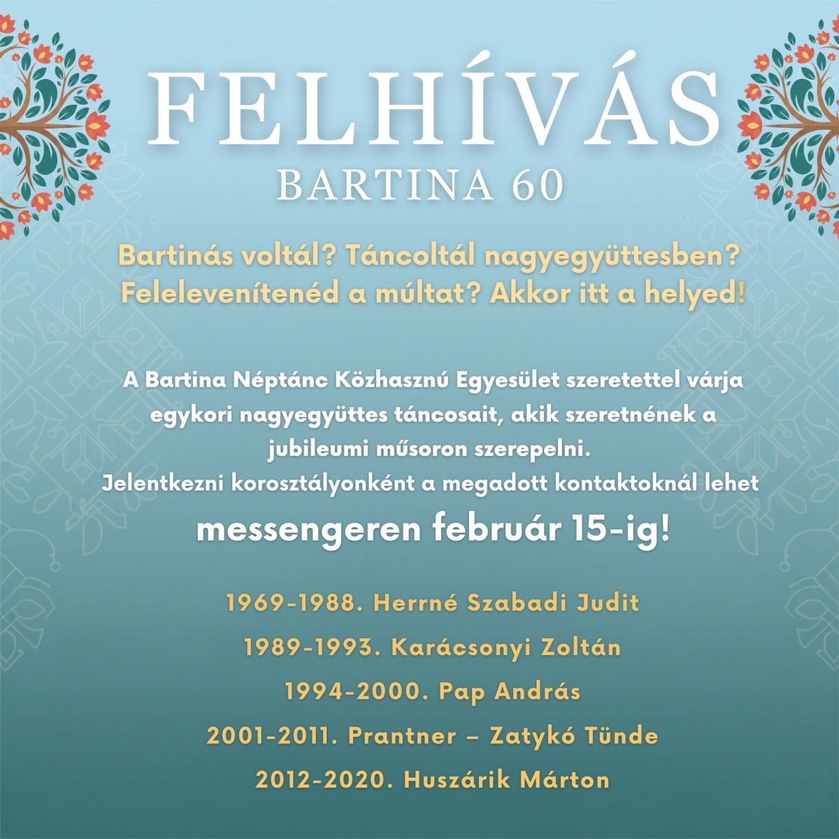 Bartina 60 – nagy eseményre készül Szekszárd kulturális közössége. Várja azon egykori táncosok jelentkezését, akik felejthetetlenné tennék ezt a szép ünnepi programot.