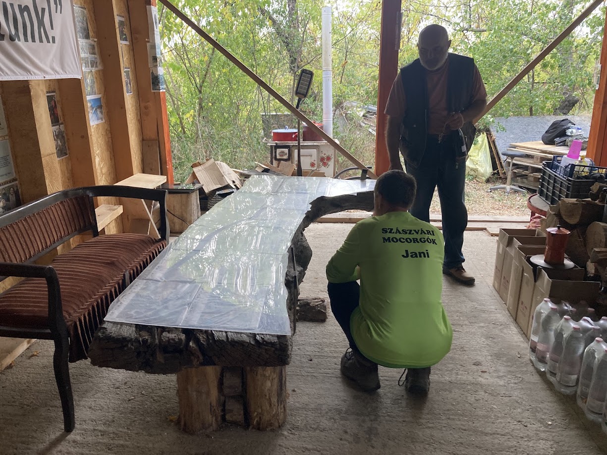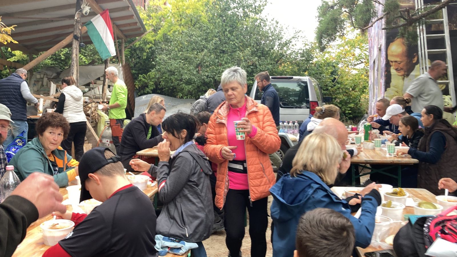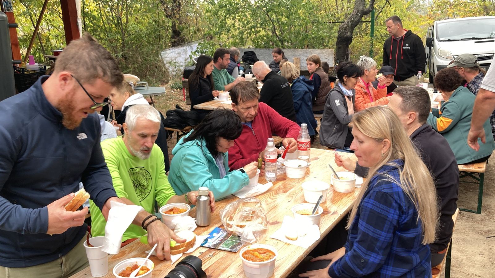 Végül paprikáskrumpli illata – melyet Galambos Tibor készített – lángos, no és szekszárdi bor várta a megfáradt túrázókat a Prajda-tanyánál, mely udvarán található az az ikonikus nyeles asztal, amit egykor körbeültek a stáb tagjai.