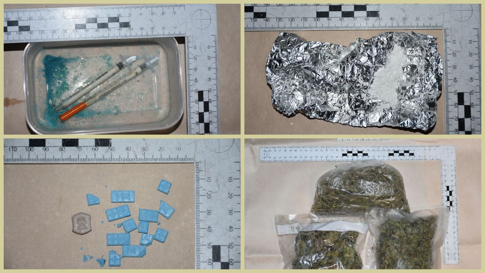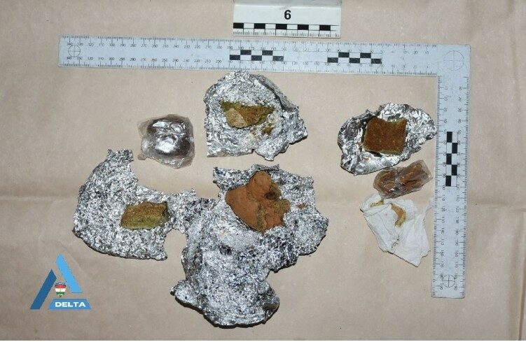 Ahol különböző fajtájú, kábítószernek minősülő anyagokat: THC-tartalmú, zöld növényi törmeléket, egyéb hatóanyagokra pozitív fehér port, hasist és tablettákat, valamint csomagolóanyagokat, őrlőt, tűket, mérleget és 230 000 forintot foglaltak le.